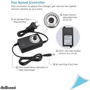 Controler de viteza pentru ventilatoare DC 3V-12V, complet ajustabil de la oprire la viteza maxima. Ajustati un voltaj diferit pentru a obtine un flux de aer diferit. Controlul de croaziera permite alimentarea ventilatorului printr-o priza AC.