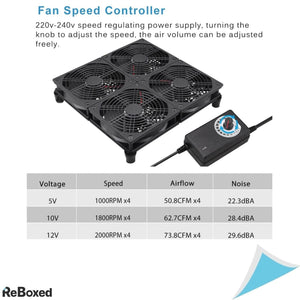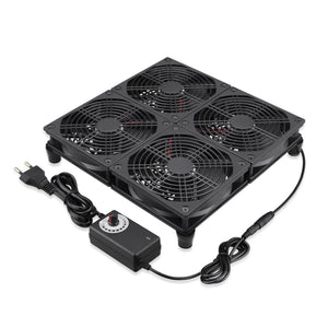 Kit ventilator 4 in 1 (Dimensiune totala: 245mm (L) x 245mm (W) x 55mm (H) / 9.64 x 9.64 x 2.16 inch per ventilator), care ofera un flux de aer foarte larg de 56.7 cmf x 4. Viteza fiecarui ventilator este de 1500 rpm. Dimensiunea mare si viteza mare a ventilatorului asigura un flux de aer puternic pentru laptopul dvs., router, amplificator, dulap, proiector, cutie TV si altele.