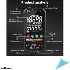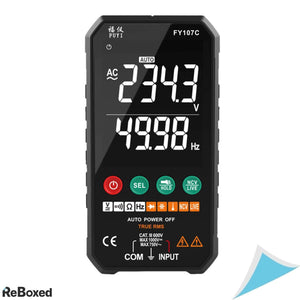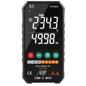 Multimetrul digital Lsaardth FY107C este un instrument de masura compact si inteligent, cu afisaj color de 3.3 inch, functie tactila si detectie automata a parametrilor. Permite masuratori precise pentru tensiune AC/DC, rezistenta, continuitate, capacitate, frecventa, diode, temperatura, NCV si cablu sub tensiune. Ideal pentru uz casnic, auto si industrial. Echipat cu lanterna, indicator baterie scazuta, oprire automata si husa de protectie.