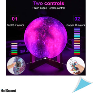 Moon Lamp este o reprezentare 3D a Lunii , o lampa de veghe care va lumina si relaxa atmosfera, din incaperea sau imprejurimile ei. Portabila si cu acumulator reincarcabil. O singura incarcare (cca 3 ore) este suficienta pentru a lumina toata noaptea. Pentru un efect WOW garantat, dispune de 16 culori, selectabile prin telecomanda sau prin Touch (7 culori se pot schimba prin atingerea inelului metalic).