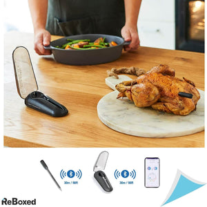 Pentru un gatit de exceptie, va recomandam termometrul wireless (proba profesionala de temperatura + aplicatie smartphone) de la Mastrad, Meat° it +. Proba dispune de o cutie de depozitare, care are si rol de extender (mareste distanta de emisie cu pana la 30 metri), care este alimentata de 2 baterii AAA (nu sunt incluse).