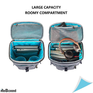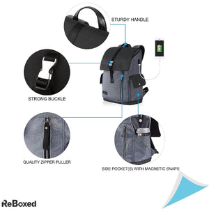 Rucsacul este fabricat din panza/polietilena rezistenta la apa, adecvat pentru laptopuri de pana la 17.3". Portul USB incorporat va permite sa va incarcati confortabil telefonul mobil, legand cablul interior la un power bank (nu este inclus in pachet). Compartimentele mari si spatioase, ofera spatiu separat pentru computer, iPad, dosare A4, portofel, haine, power bank si multe altele. Buzunarul cu fermoar si buzunarul cu inchidere velcro pot stoca articole mici, care sunt folosite frecvent.