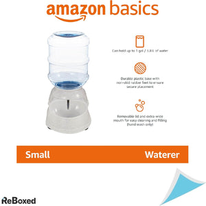 Amazon Basics Dog and Cat Water Feeder, Small, 1 Gallon (3.8 liters), Transparent este un dispenser de apa automat pentru caini si pisici, conceput pentru a furniza apa proaspata pe tot parcursul zilei, fara a fi necesara reincarcarea frecventa. Cu un design simplu si transparent, poti controla usor nivelul de apa, iar constructia robusta face ca acest dispozitiv sa fie potrivit pentru utilizare zilnica in casa sau in gradina.