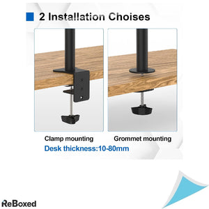 Designul inteligent permite instalarea fie prin clema de prindere pe marginea biroului, fie prin prindere in gaurica (grommet), fiind compatibil cu blaturi de pana la 80 mm grosime. Astfel, vei economisi mai mult de 80% din spatiul biroului comparativ cu suporturile clasice cu baza grea.